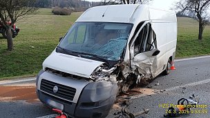 U dopravní nehody osobního a nákladného vozidla zasahují hasiči v obci Heřmanova Huť. Hasiči provedli zajištění místa nehody a protipožární opatření na vozidlech.